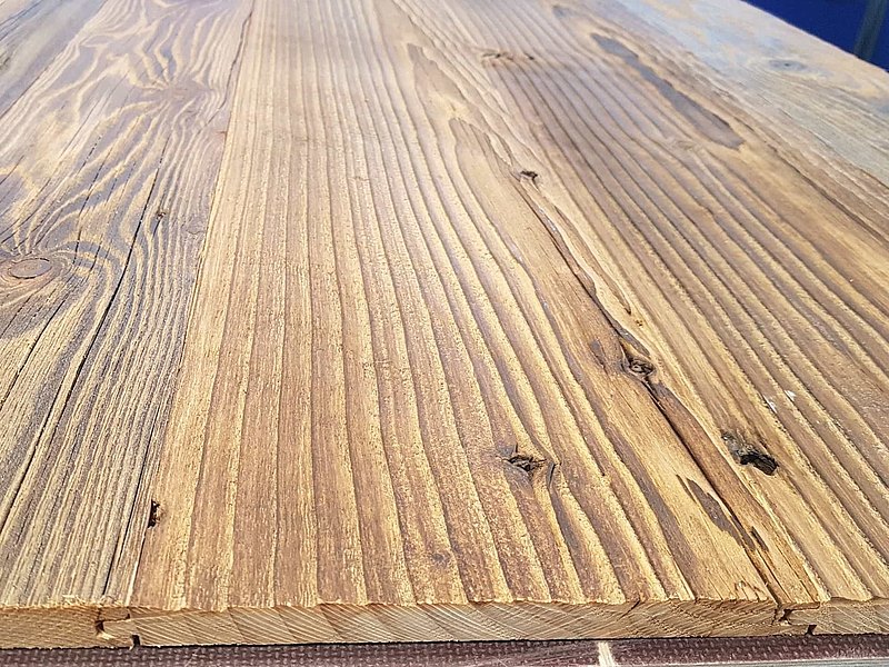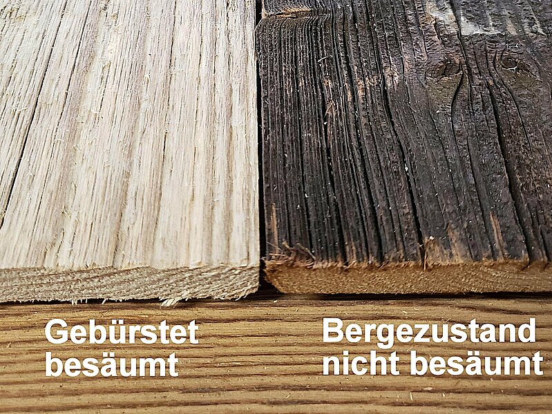 Die Oberfläche des Holzes wird mit einer rotierenden Nylonbürste bearbeitet. Dadurch lösen sich weiche Holzteile und Dreck aus der Oberfläche, die harten Bestandteile bleiben und definieren eine strukturierte Oberfläche.