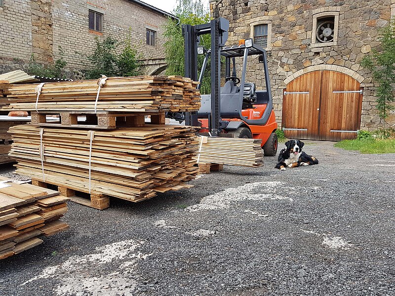 Unsere Altholzbretter, Balken, Granitplatten und Ziegel erhalten Sie auf Paletten verpackt per Spedition.